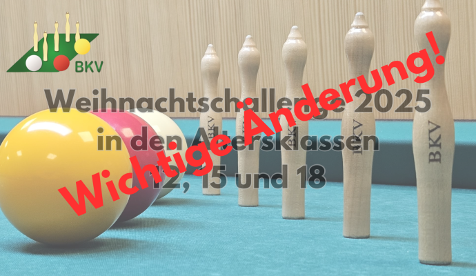 Home Weihnachtsgrüße 7. und 8. Spieltag der 1. Bundesliga Wichtige Änderung Weihnachtschallenge 7. und 8. Spieltag der 2. Bundesliga 5. und 6. Spieltag der 1. Bundesliga German Masters 2025 Deutsche Meisterschaften des BKV 2025