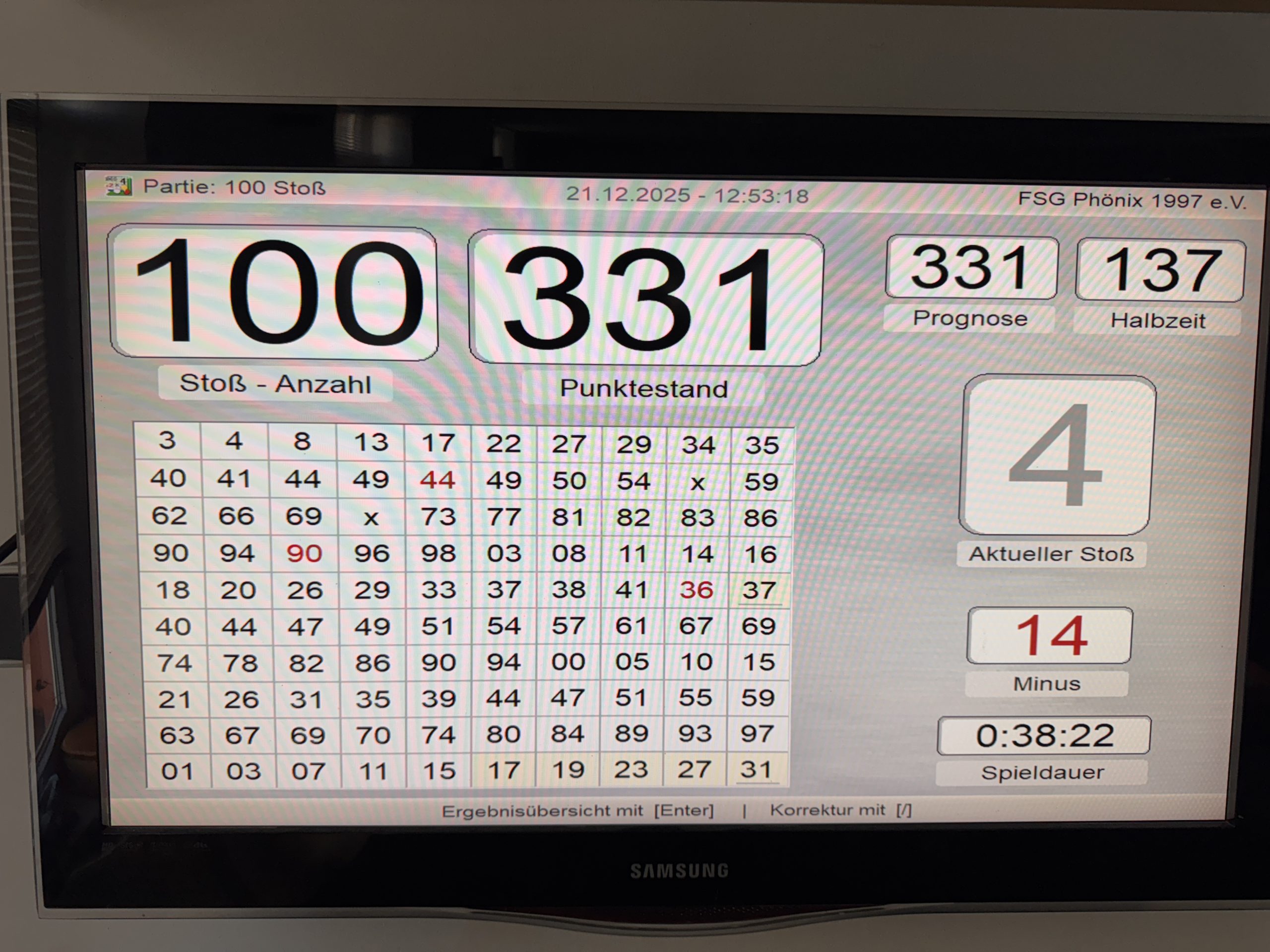 Am 4. Advent ging es wieder ran. Die Ansprachen in Leipzig hatten es in sich. Kein Auge blieb trocken. Doch das Feuer ließ sich leider nicht so ganz auf das Spiel übertragen. 799 zu 826. zur Halbzeit. Danach sollte die Hütte brennen. Also zumindest für 50 Stoß. Marschi (331) überragend mit 194 in der 2. Somit waren die Weichen für die Gäste in der Messestadt gestellt. Auch ein, wie bereits am Vortag gut aufgelegter Robert Lehmann (315) konnte am Ausgang nichts mehr ändern. Das vom Hinspiel noch totgeglaubte Rehlein (Mario Gehrke) ließ als Schlussspieler nichts anbrennen und tütete die Punkte ein. Endstand 1647 zu 1729 zum Sieg für Chemnitz.